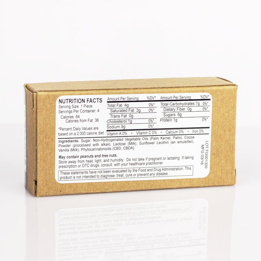 Ingredients (Dark Chocolate): Sugar, Non-Hydrogenated Vegetable Oils (Palm Kernel, Palm), Cocoa Powder (processed with alkali), Lactose (Milk), Sunflower Lecithin (an emulsifier), Vanilla (Milk), Phytocannabinoids (CBD, CBDA)