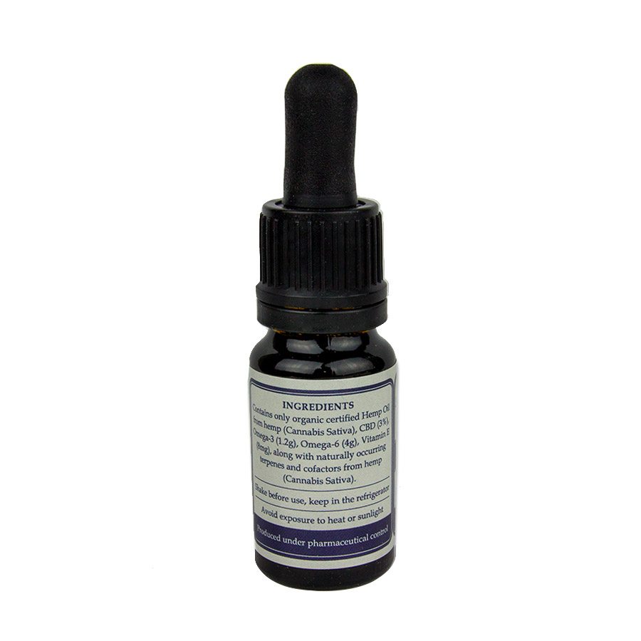 Hemp seed oil (80%), Omega 3 (1.25g), Omega 6 (4g), Vitamin E (8mg) phytocannabinoids cannabidiol 3% (CBD 300mg), low concentrations of the natural forms of (CBC, CBG, CBN)