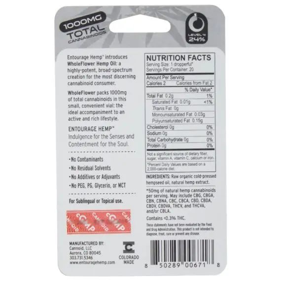Entourage WholeFlower Hemp Oil consists of full spectrum, quality CBD oil. Blended into smooth, organic hemp seed oil and enhanced with proprietary cannabis terpenoids, these new tinctures are therapeutically-active, easy to consume, and very strong.