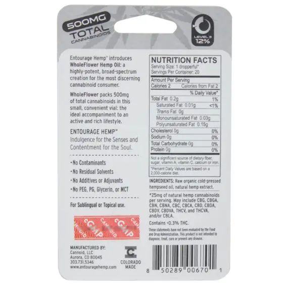 Entourage WholeFlower Hemp Oil consists of full spectrum, quality CBD oil. Blended into smooth, organic hemp seed oil and enhanced with proprietary cannabis terpenoids, these new tinctures are therapeutically-active, easy to consume, and very strong.