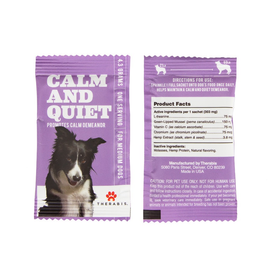 Using Therabis? Calm and Quiet hemp for pets is extremely simple. Once per day, just sprinkle one full packet onto your dog?s food.