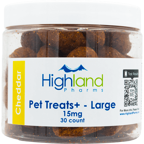 These Pet Treats have 15mg of CBD in each treat. There are 30 Large Treats in the container.