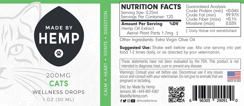 Each 1 oz bottle of Made By Hemp: CBD Tincture for Cats contains: