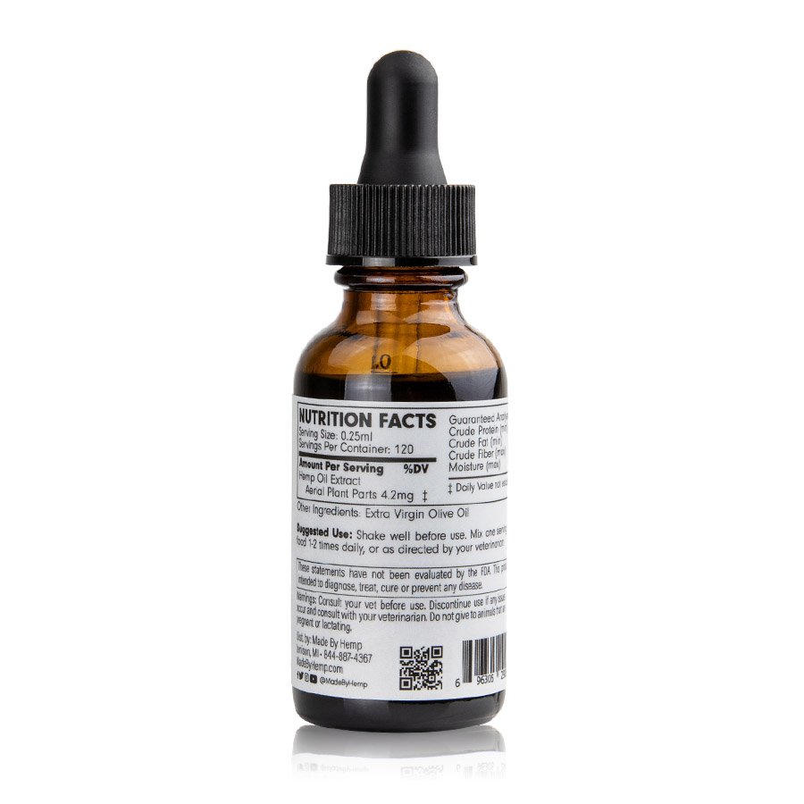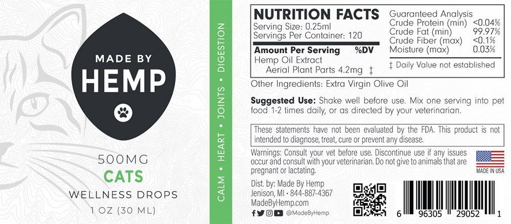Each 1 oz bottle of Made By Hemp: CBD Tincture for Cats contains: