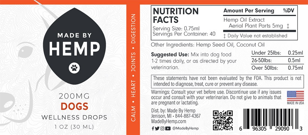 This full-spectrum hemp oil from Made By Hemp has been specially formulated for your four-legged friend?s diet. Packed with essential nutrients and phytocannabinoids, each bottle contains 200 mg of soothing CBD.