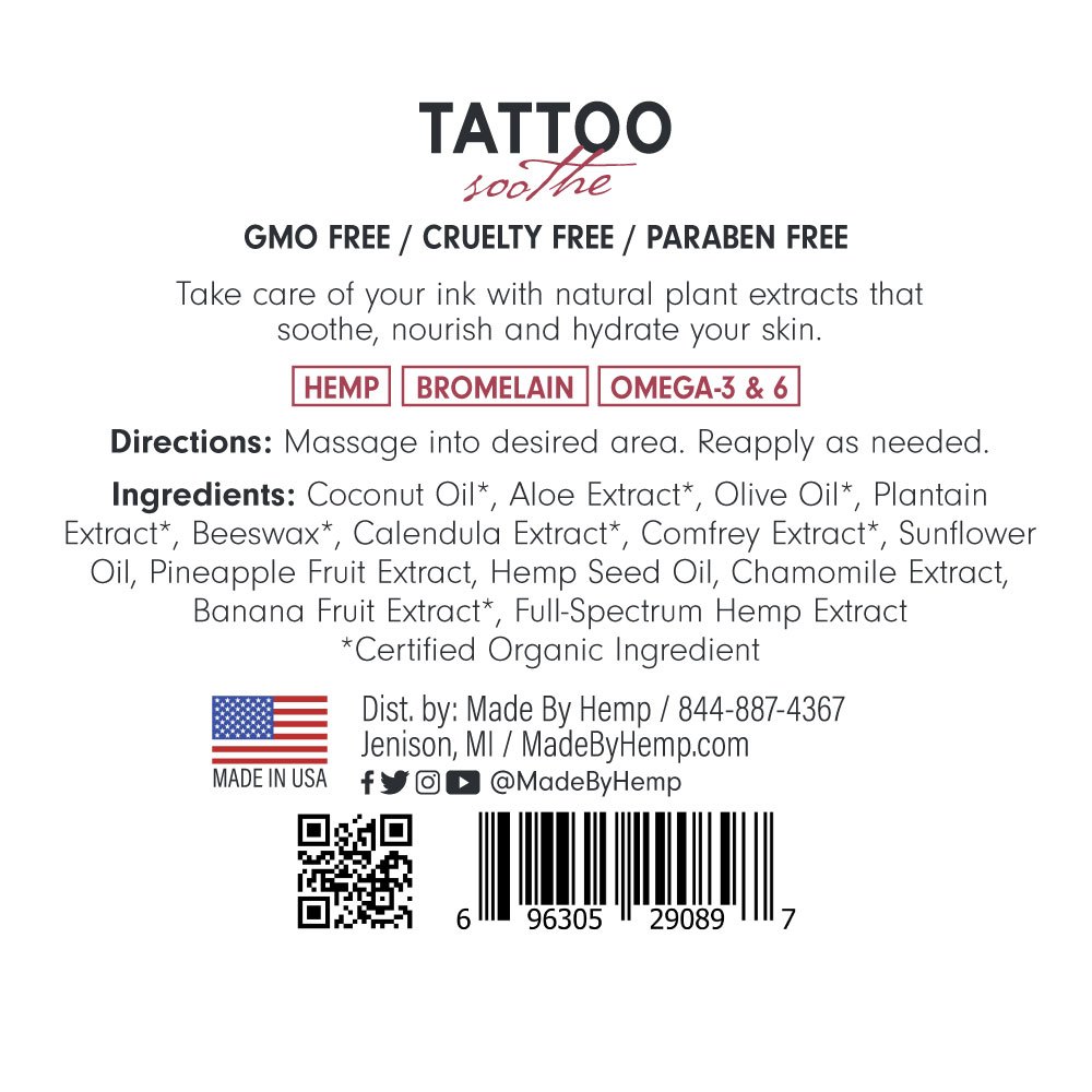 Take care of your ink with natural plant extracts that soothe, nourish and hydrate your skin. Made By Hemp Tattoo Soothe is an aftercare balm infused with CBD from hemp, bromelain, omega-3, omega-6, aloe, and other soothing ingredients.